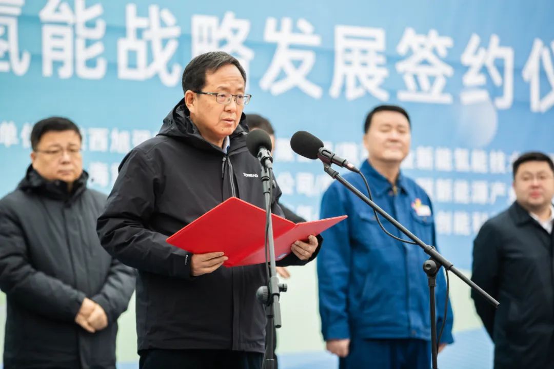 陜西省能源局副局長(zhǎng)劉齊,韓城市委副書記張景鋒,韓城市政府黨組成員、副市長(zhǎng)郭繼鋒,陜西省工業(yè)和信息化廳原材料工業(yè)處副處長(zhǎng)謝韜,陜鋼集團(tuán)副總經(jīng)理韋武強(qiáng)、龍鋼公司黨委書記、董事長(zhǎng)陳驍、維納氫能執(zhí)行董事宋琦、旭強(qiáng)瑞公司總經(jīng)理王進(jìn)輝等氫能企業(yè)代表共同出席。