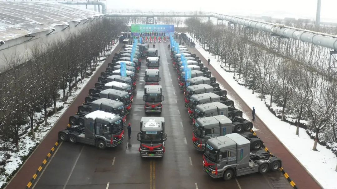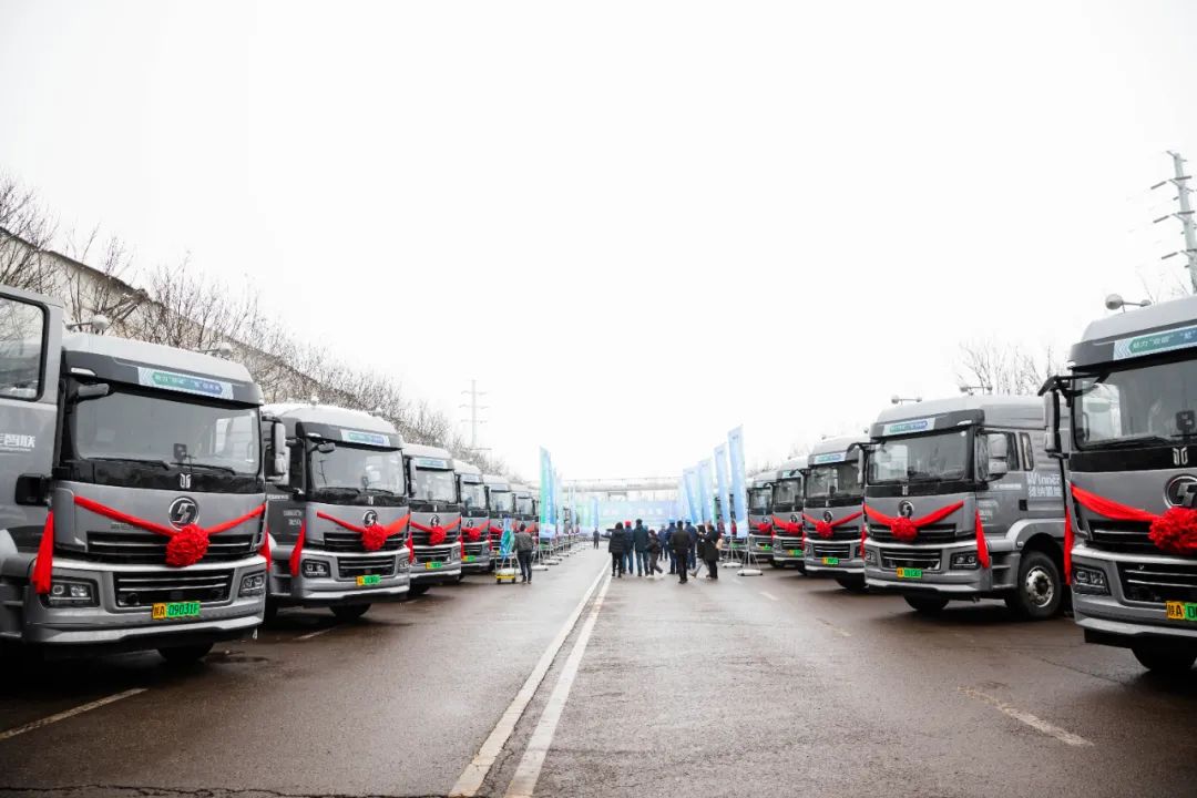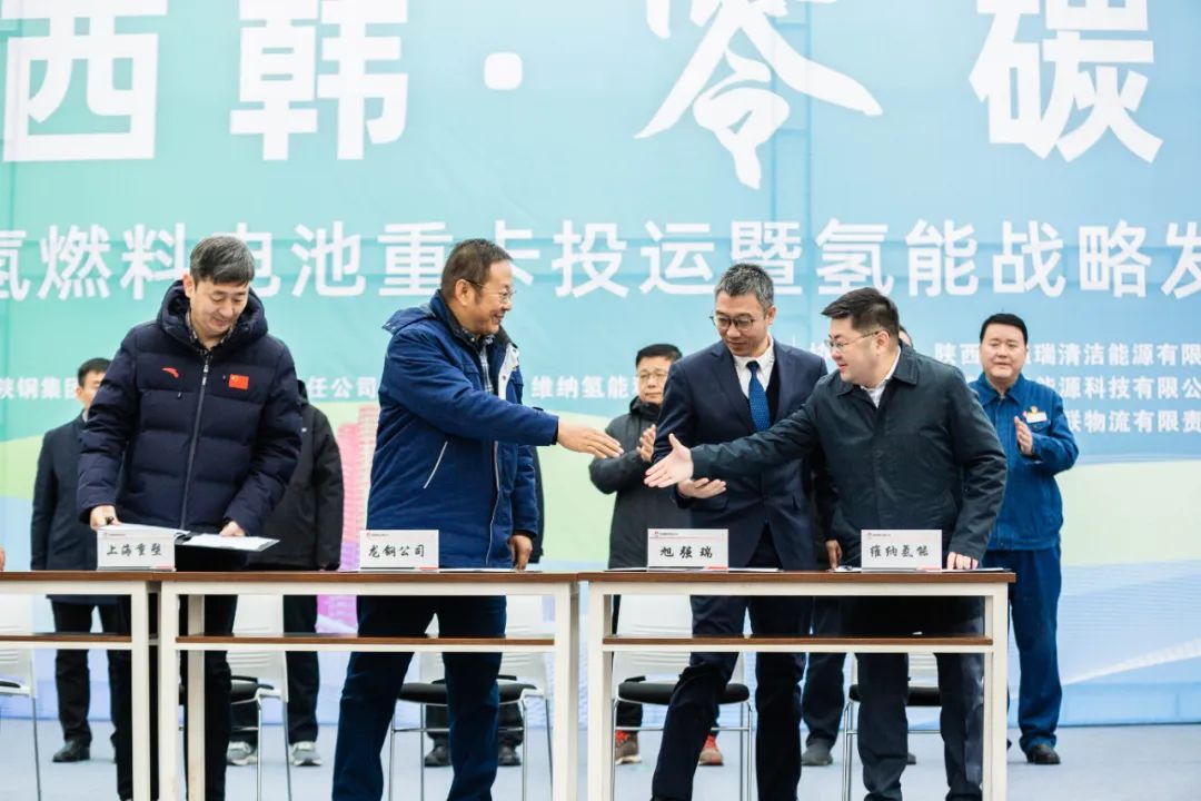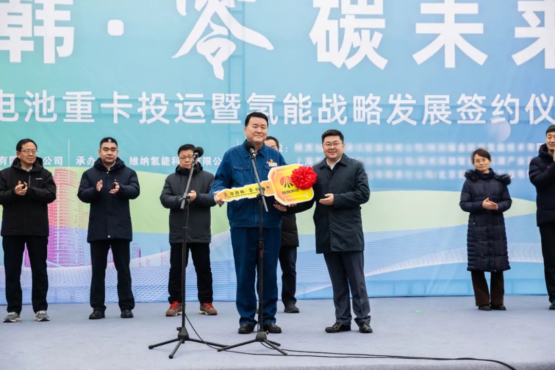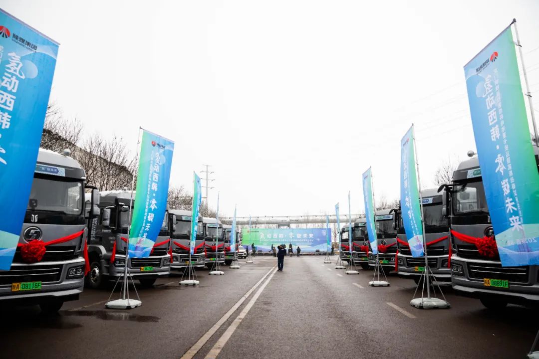 在會(huì)場(chǎng)所有領(lǐng)導(dǎo)的見證下,維納氫能執(zhí)行董事宋琦向陜鋼集團(tuán)龍鋼公司黨委書記、董事長(zhǎng)陳驍交付車輛鑰匙,伴隨韓城市委副書記張景鋒的宣布,33輛重卡鳴笛啟動(dòng),以氫能重卡為核心的綠色運(yùn)輸工作正徐徐展開。